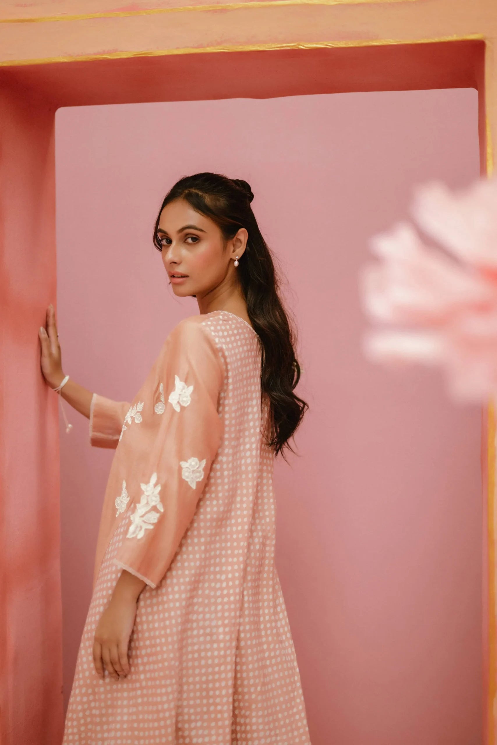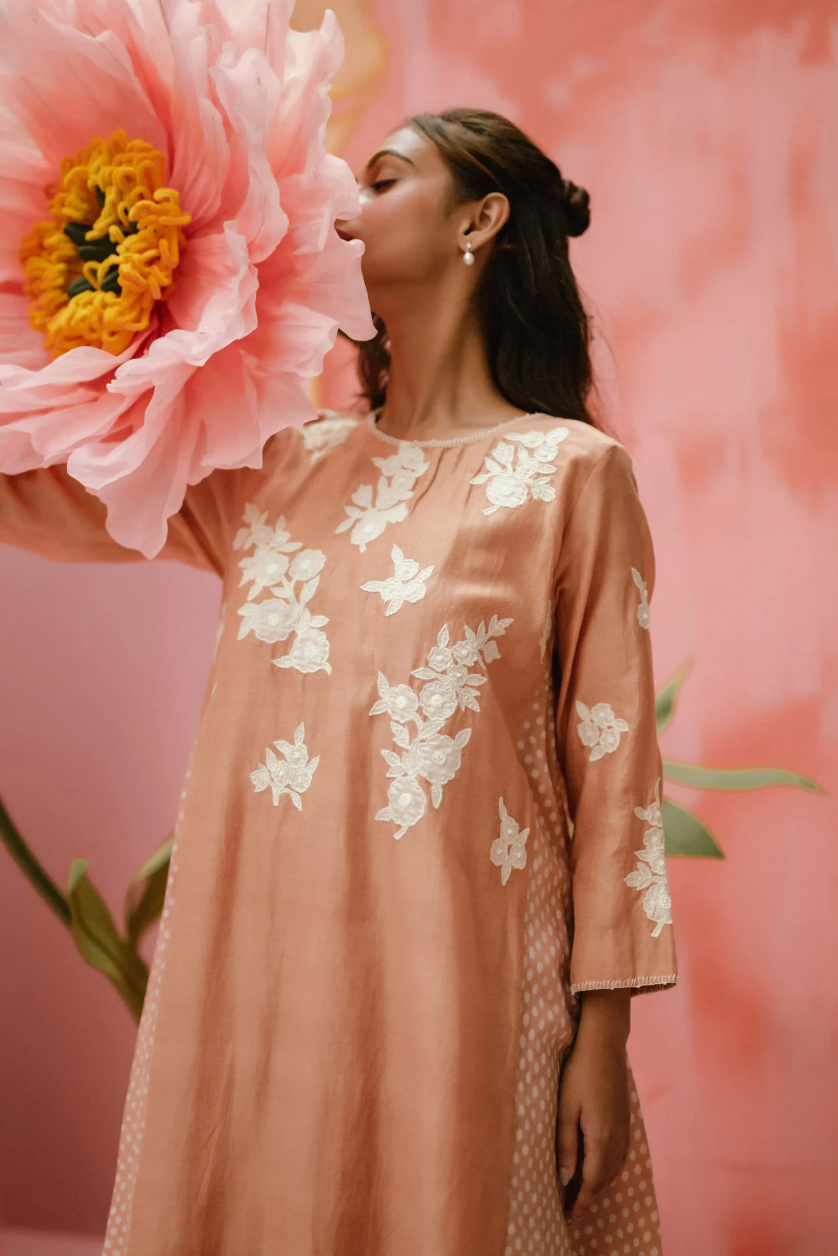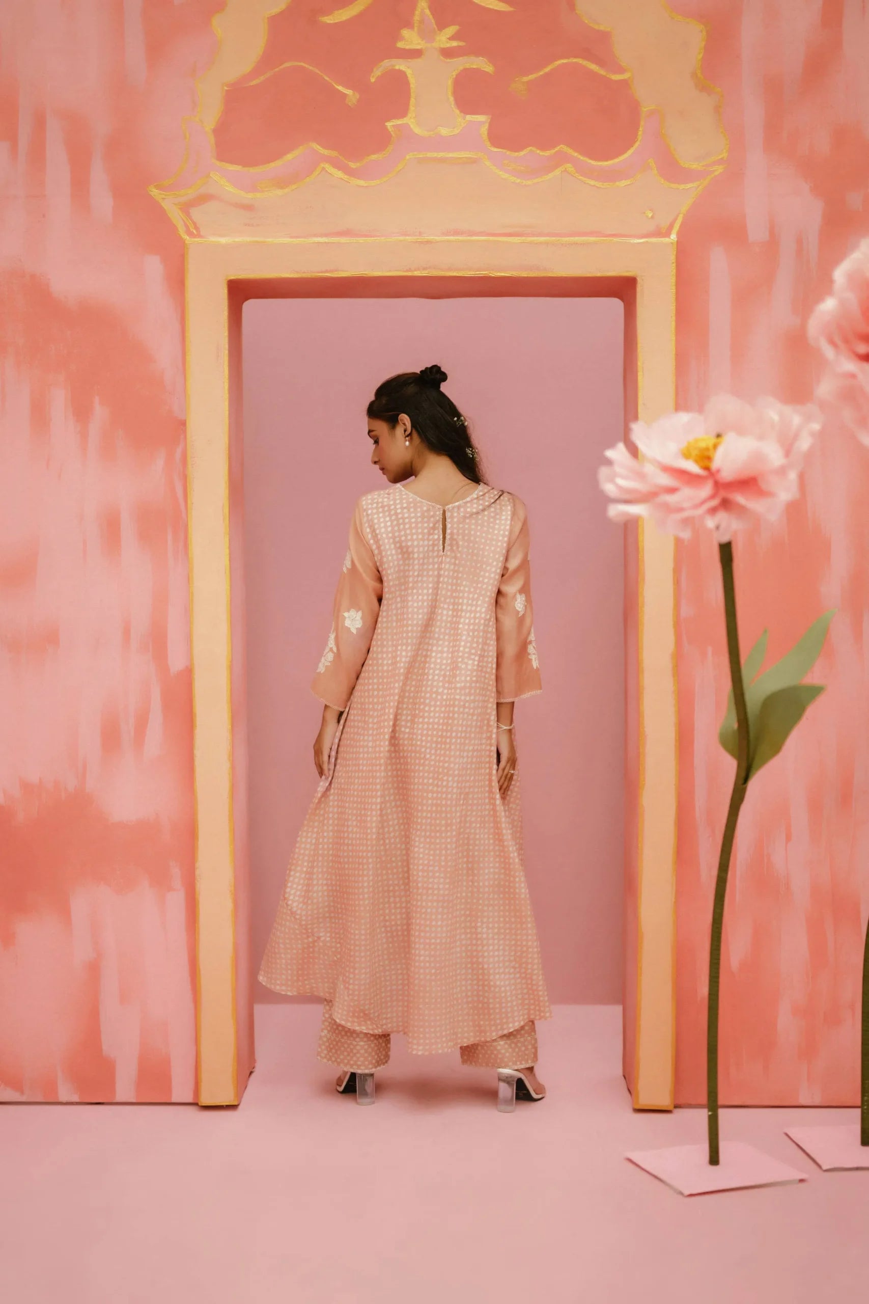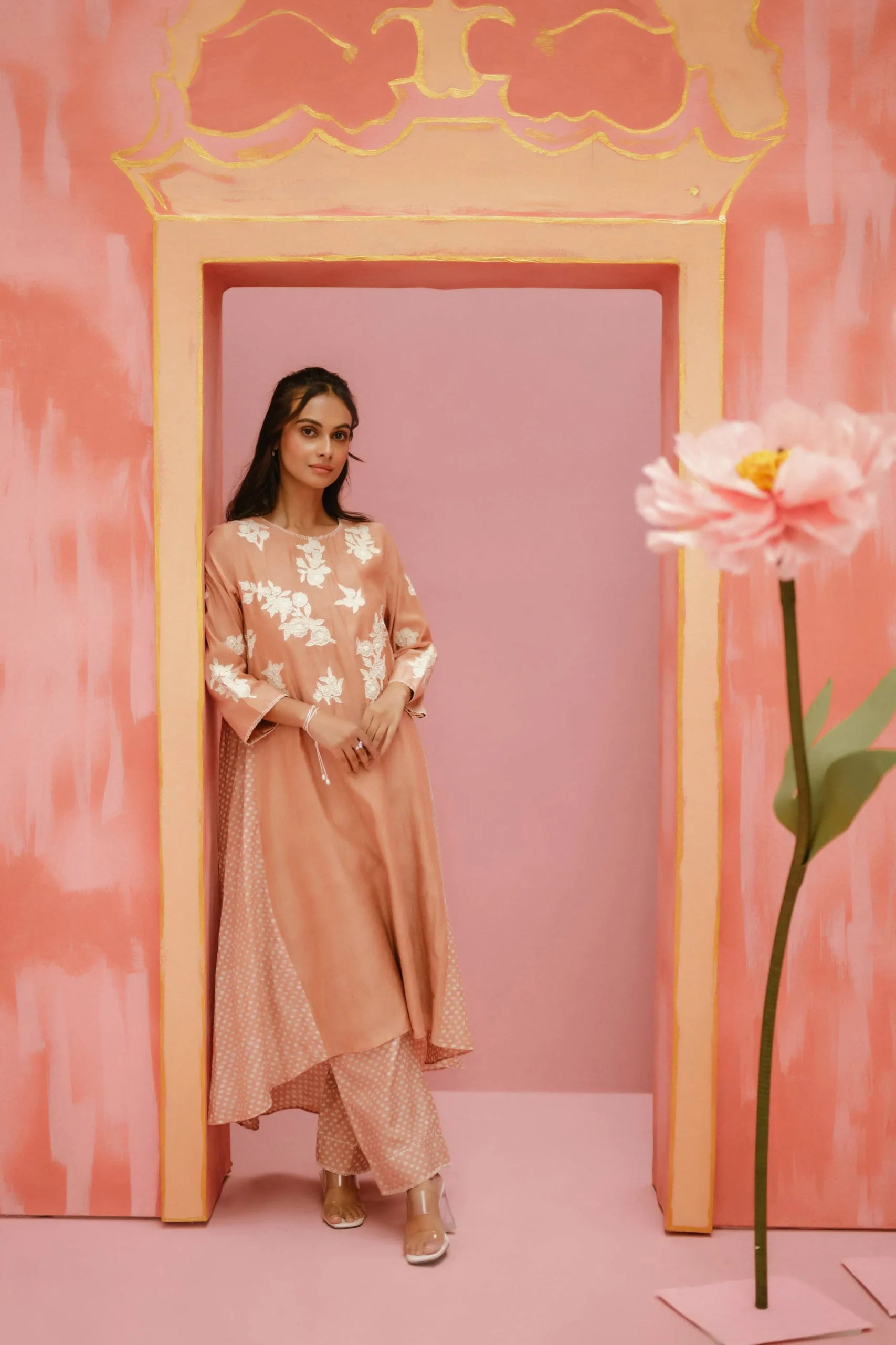 Product Description: Our Solenne set throws a shade at modern festivities. Made in block printed handwoven chanderi.The set is softly crafted with hand embroidered yoke and applique details on the front.