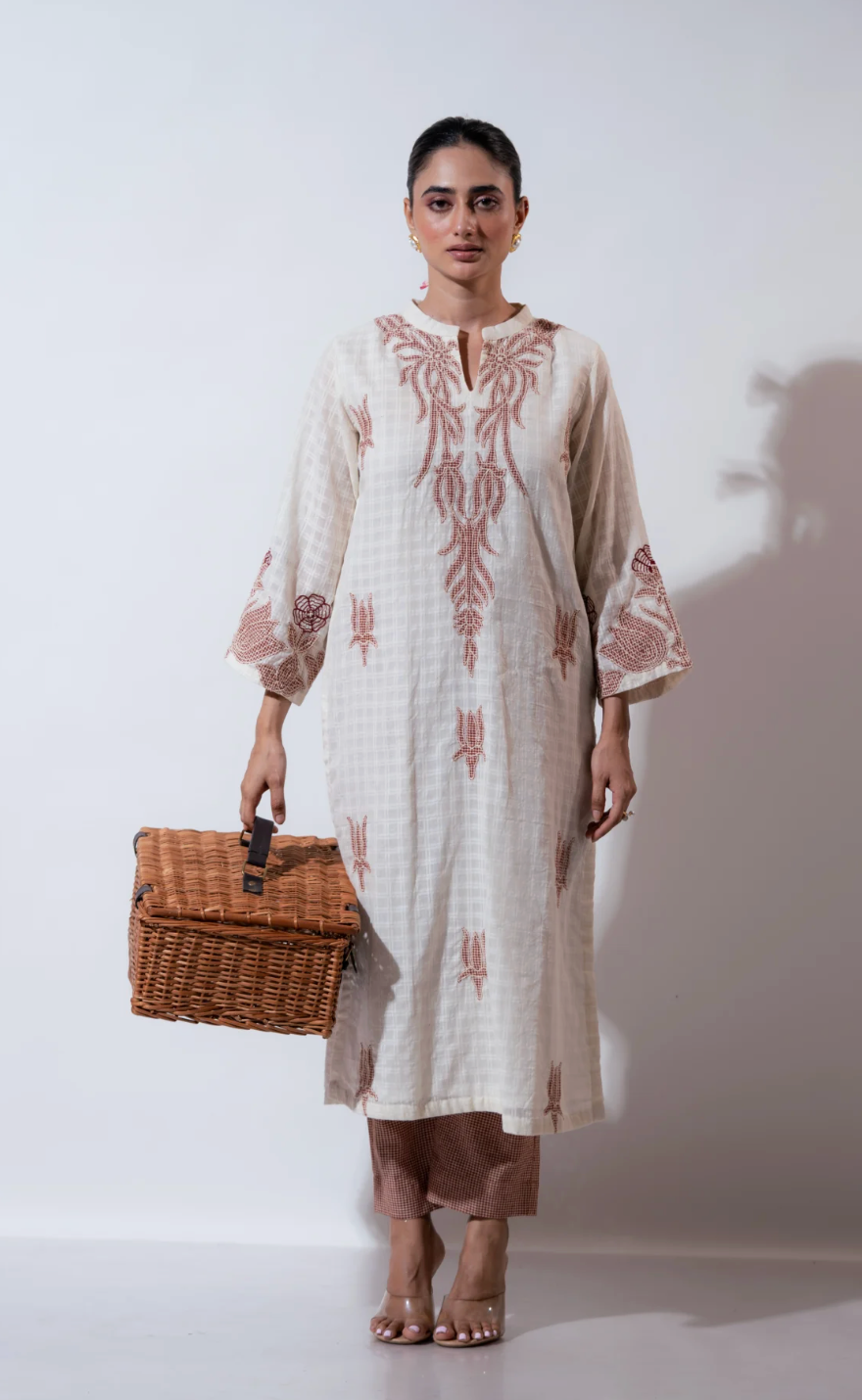Product Description: This elegant kurta set features a cream checkered base adorned with intricate brown thread applique embroidery, three-quarter sleeves, and a notched neckline. Paired with contrast brown pants.