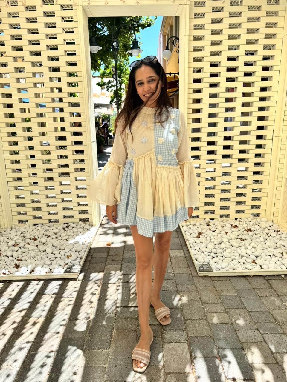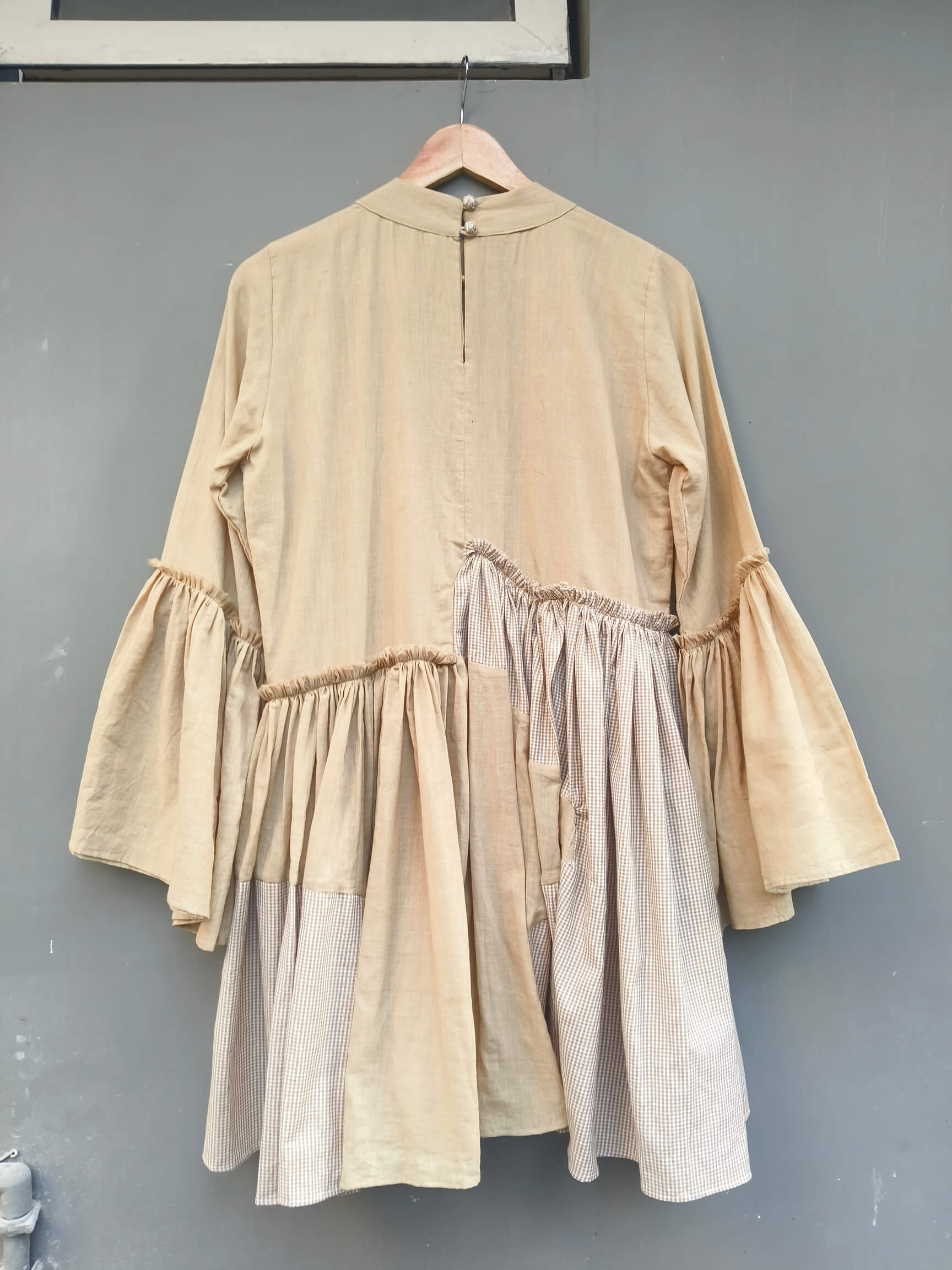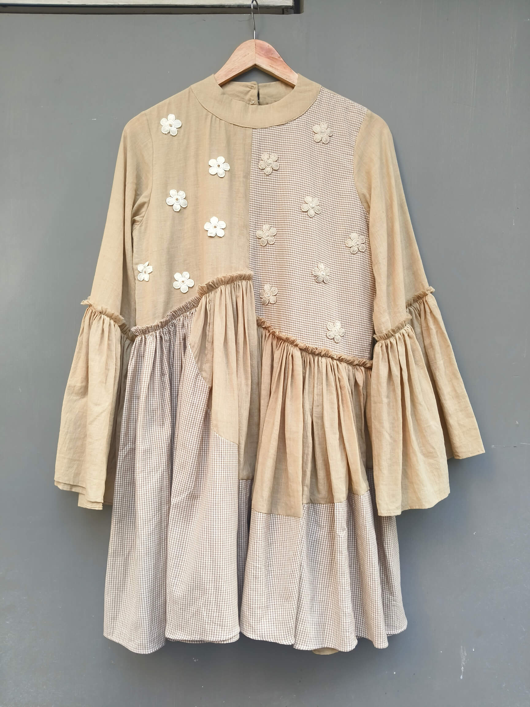 Product Description: This checkered tunic features flared sleeves, gathered asymmetric hem, and contrasting floral appliqué. A chic fusion of prints, textures, and embroidery creates a playful, modern, and artistic silhouette