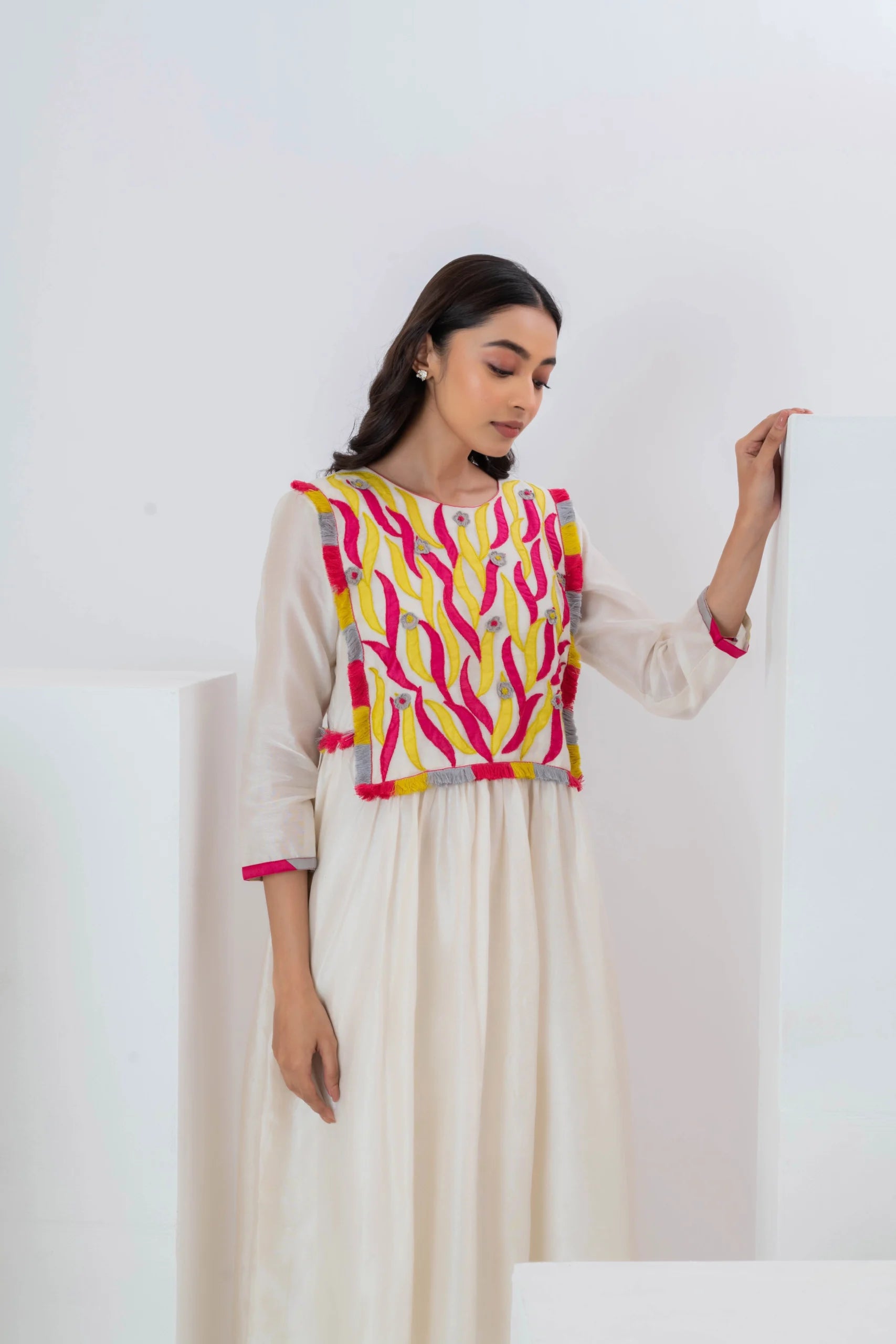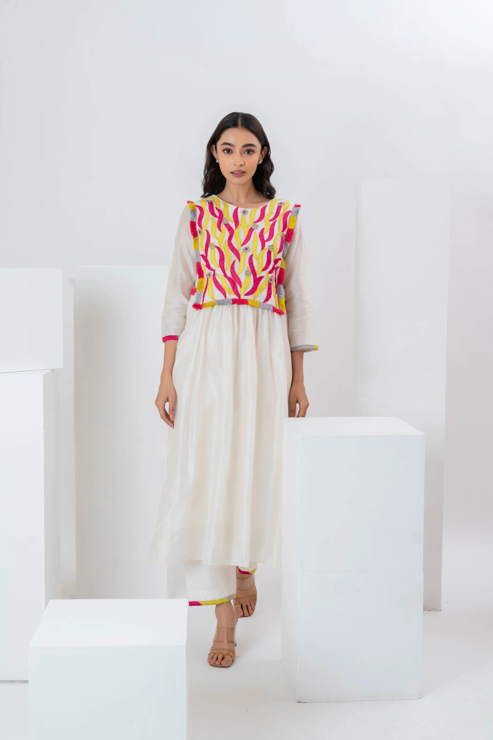 Product Description: Featuring an ivory gathered kurta in malai chanderi base with applique floral work and tassel detailing. It is paired with straight trousers. Style it with some colorful accessories like a statement necklace or a stack of bracelets for a festive look.