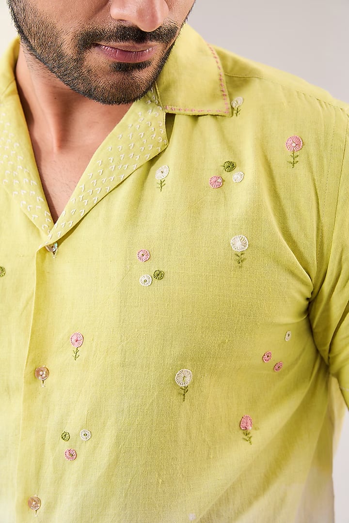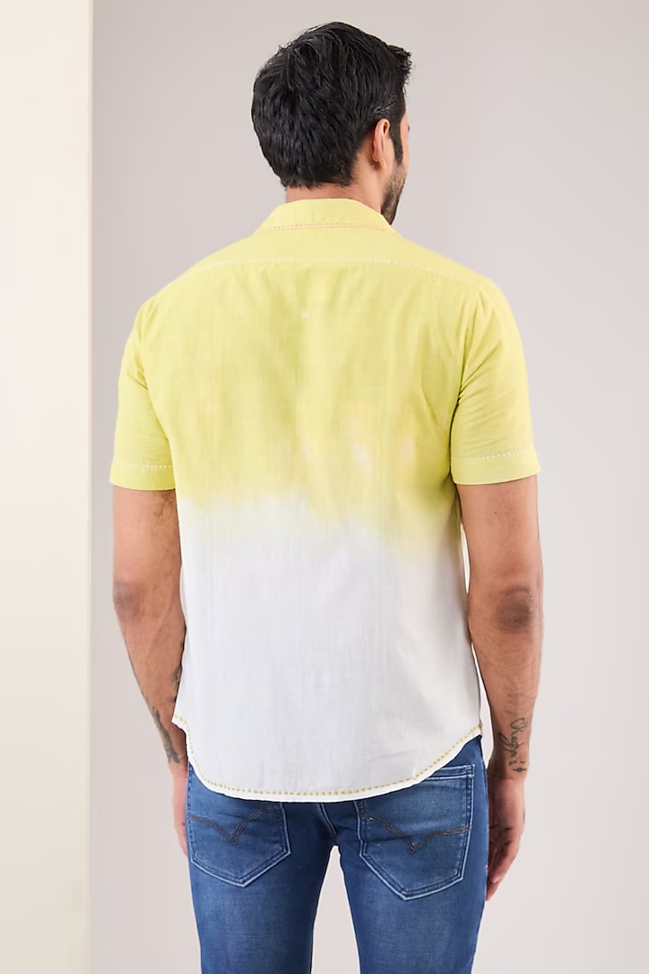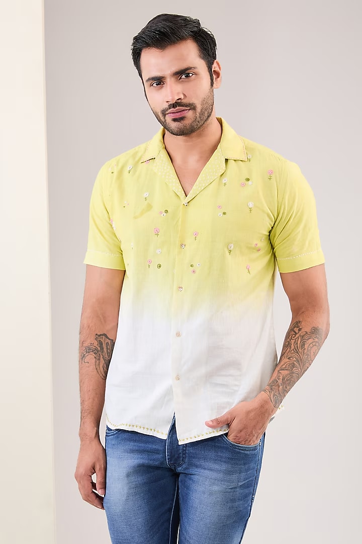 Product Description: Featuring an ivory dip dyed shirt in handwoven cotton silk base with a camp collar and hand embroidery. Ideal for casual wear and occasions that embrace a carefree spirit.