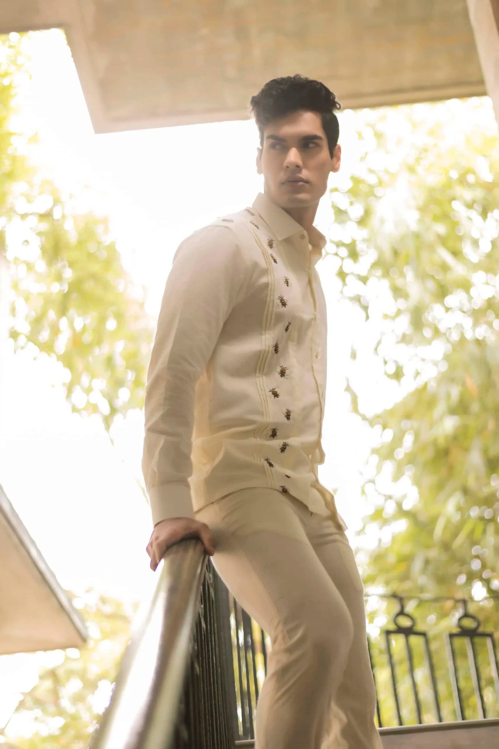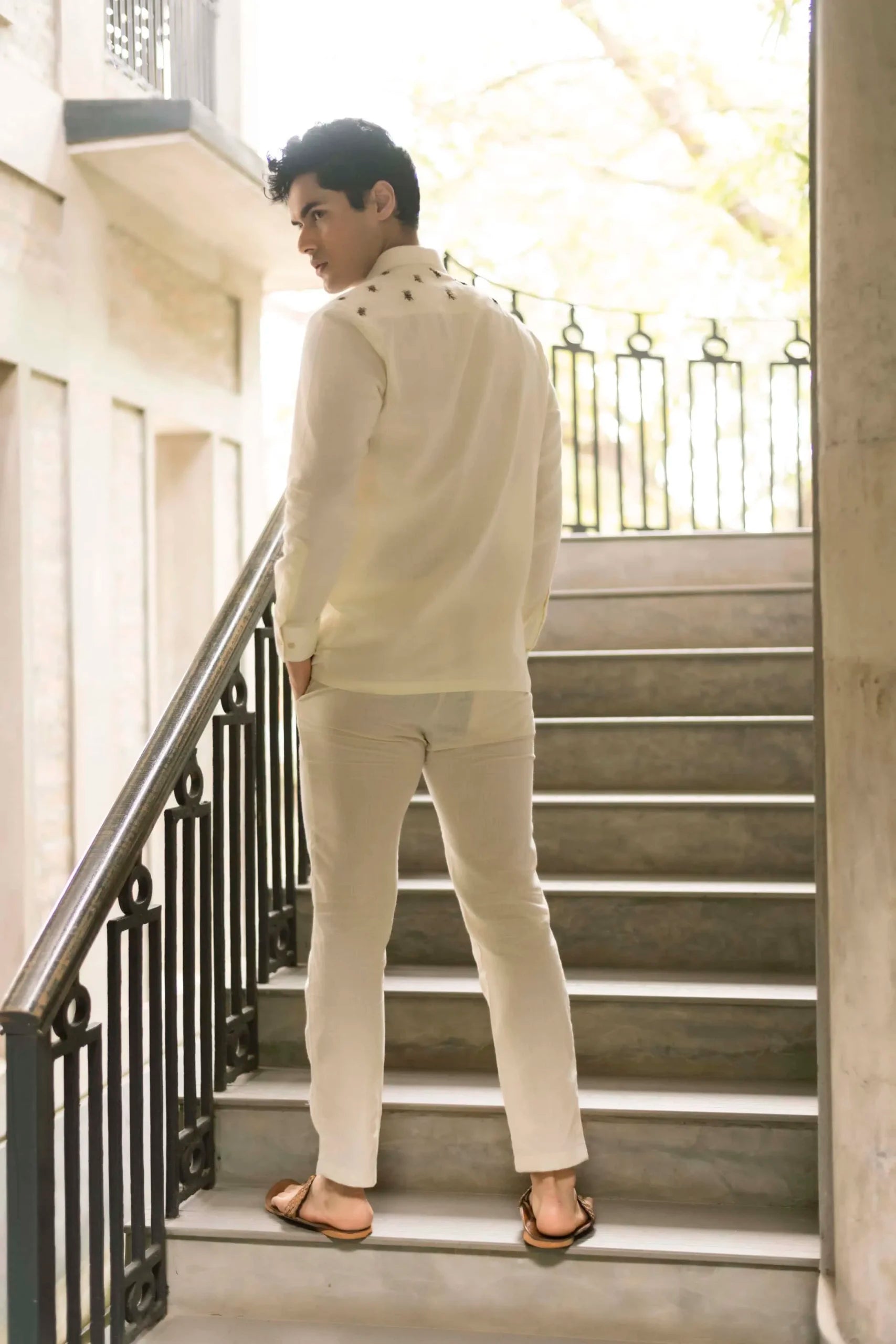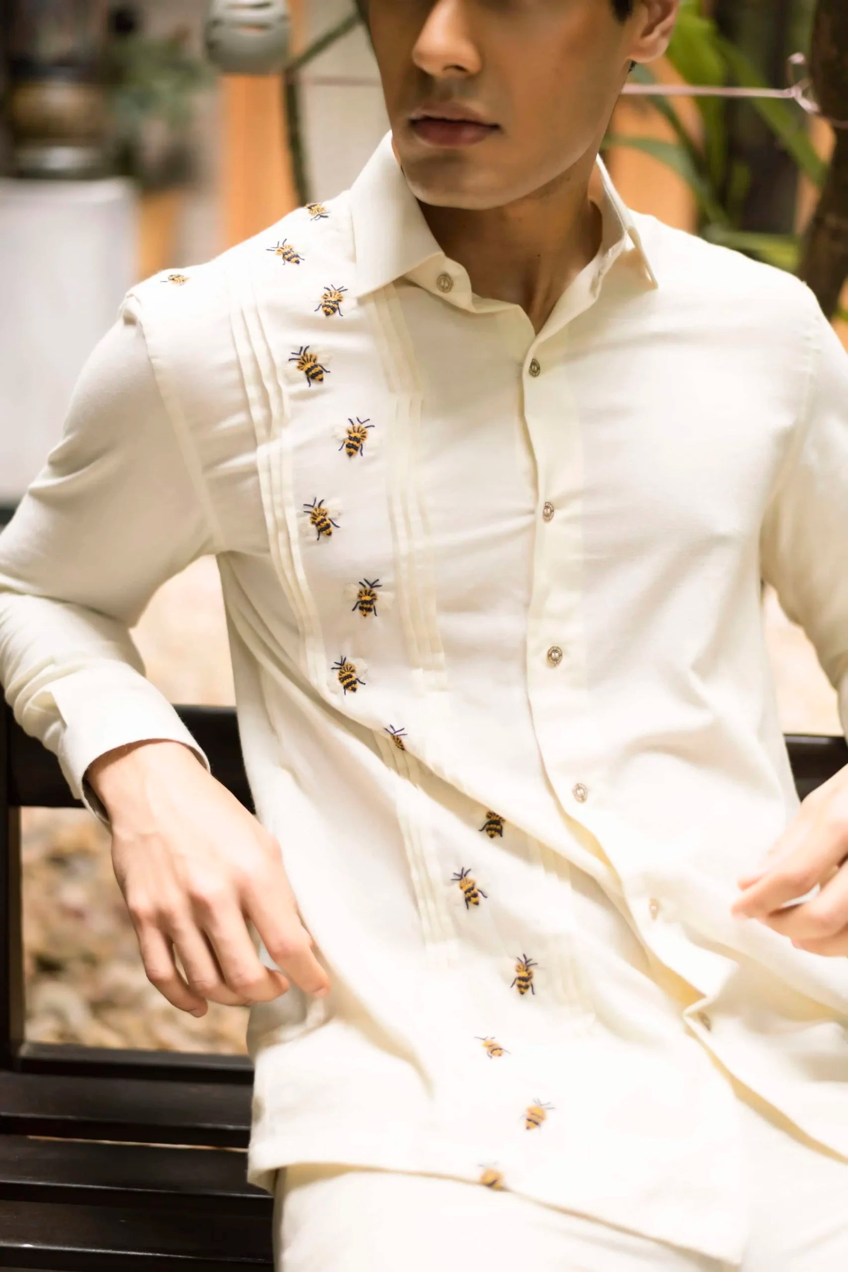 Product Description: Off-white handwoven cotton shirt with pleated detailing at right side and thread embroidery.
