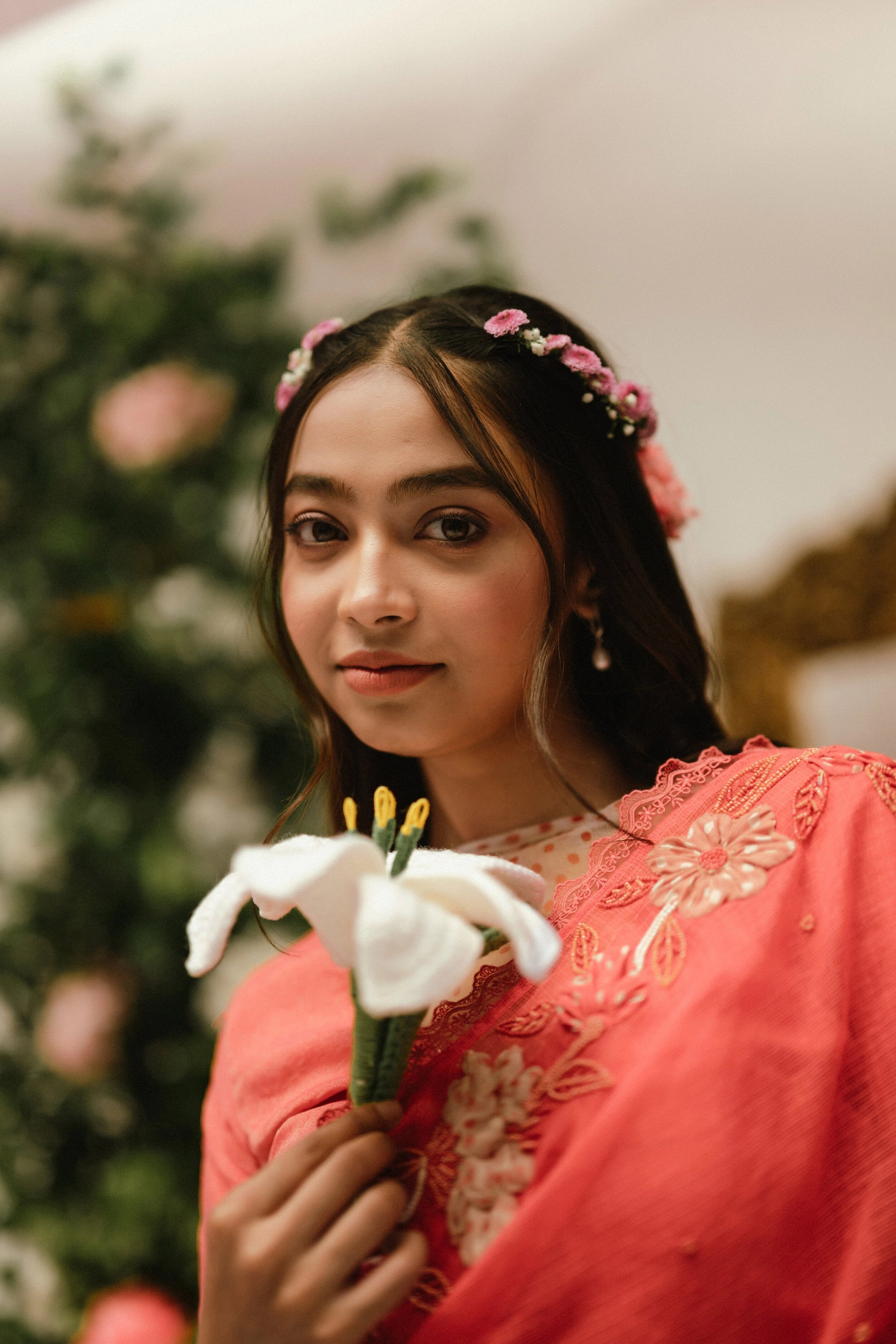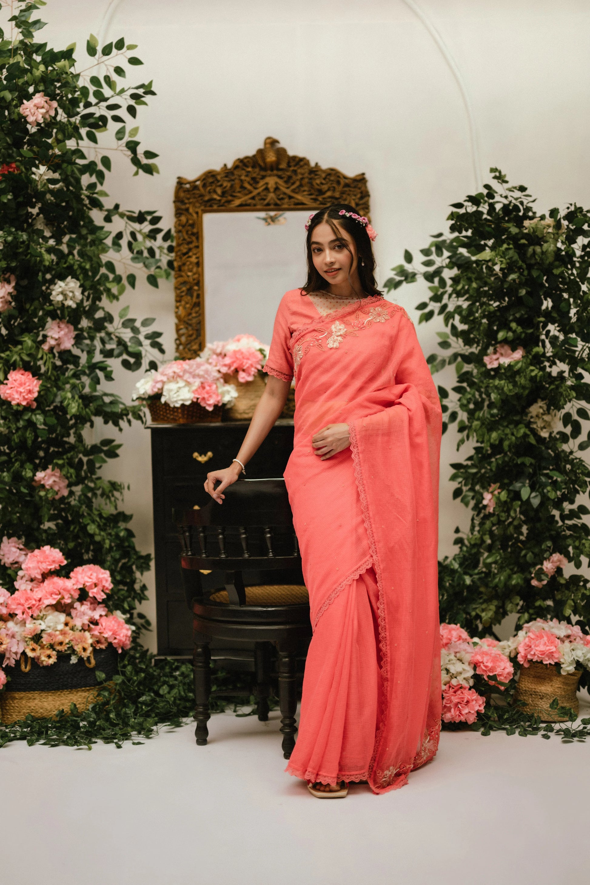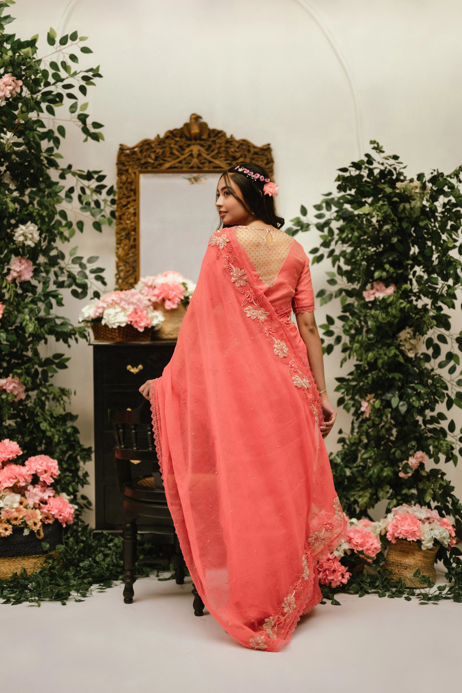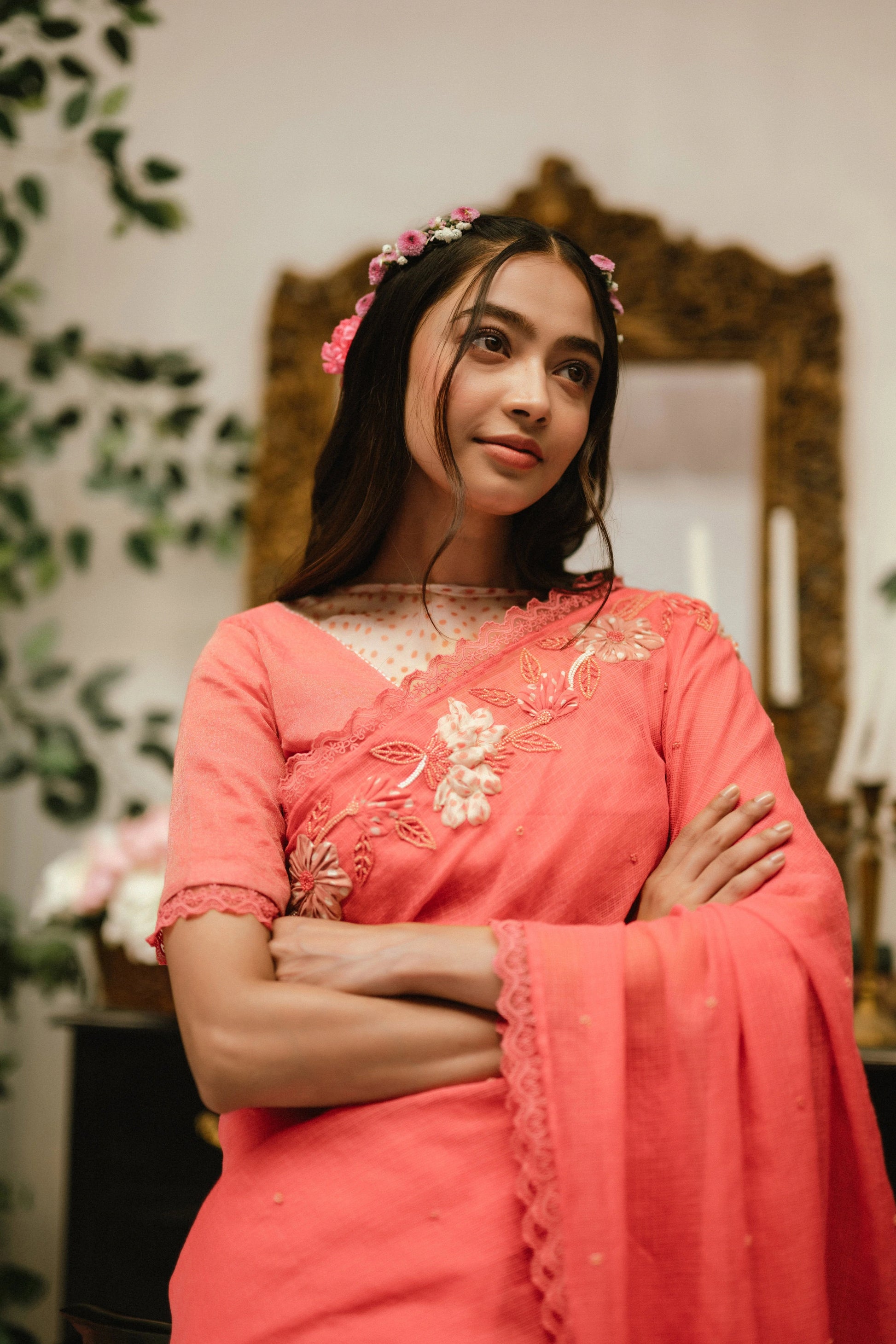 Product Description: Our Valentino sari is a statement of romantic elegance! Made in the finest variety of kota doria with beautiful 3D hand appliqued flowers, it comes with lace detailing throughout the hemline. Paired with a dreamy, stitched tissue blouse adorned with block printed organza inlay.