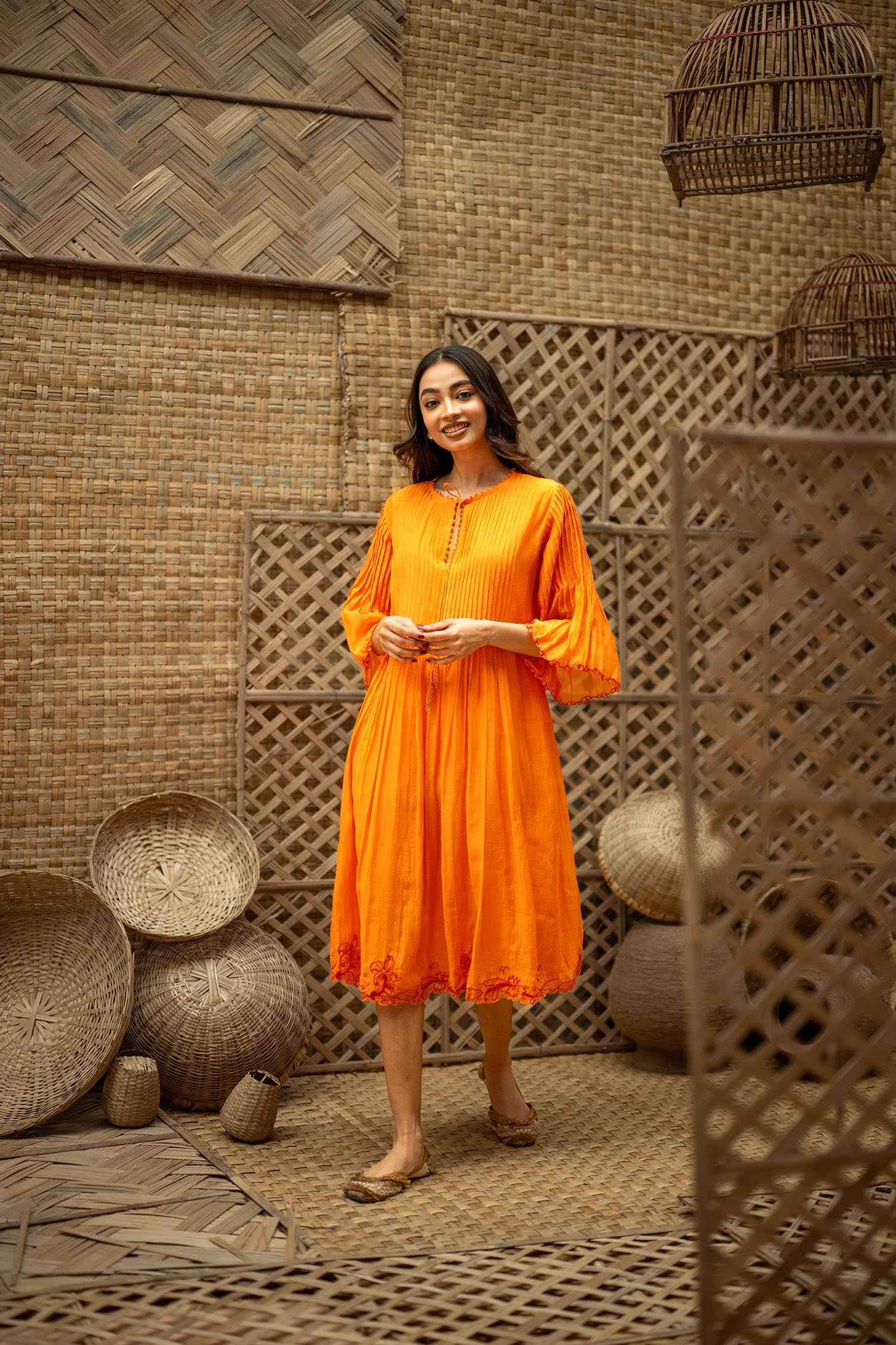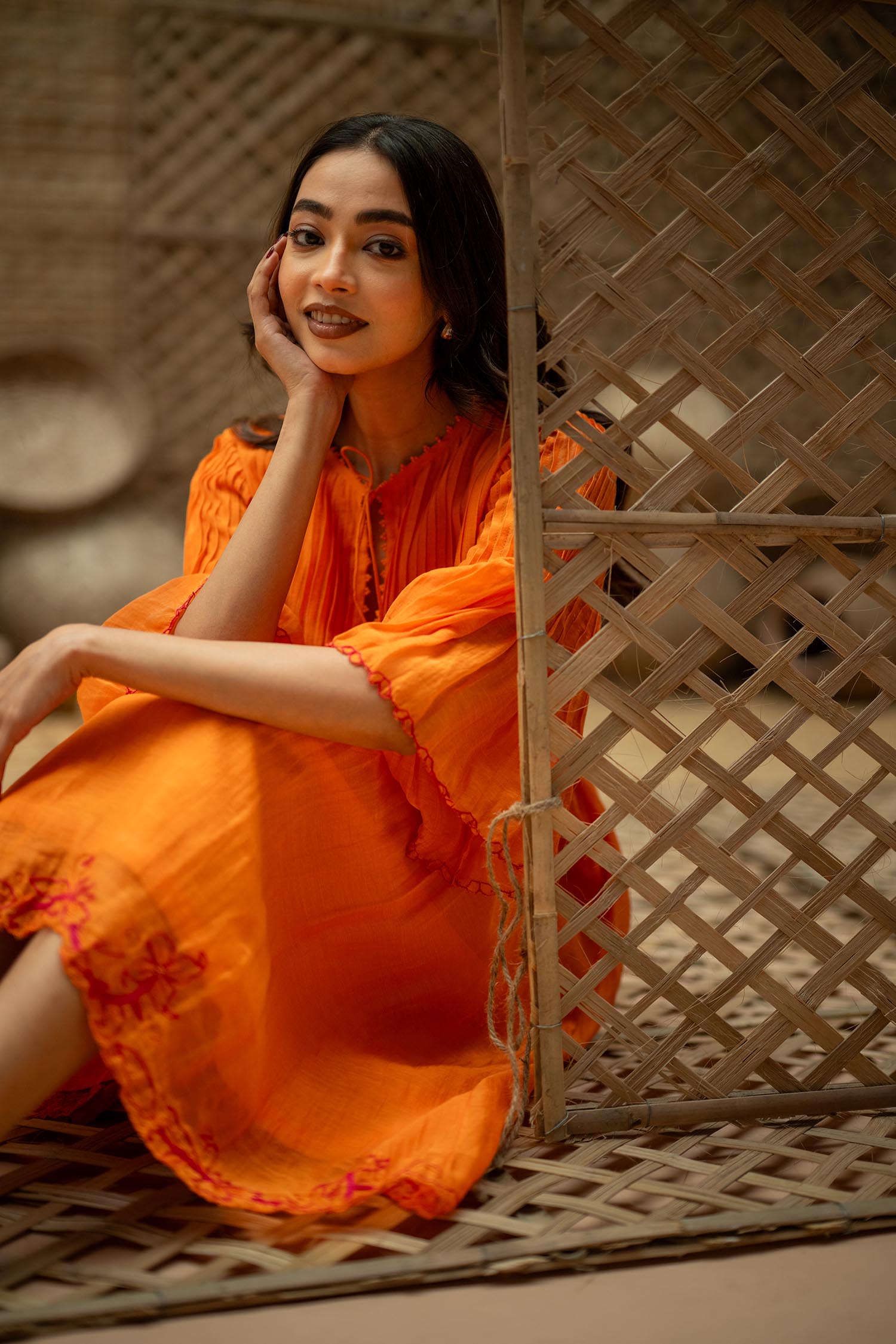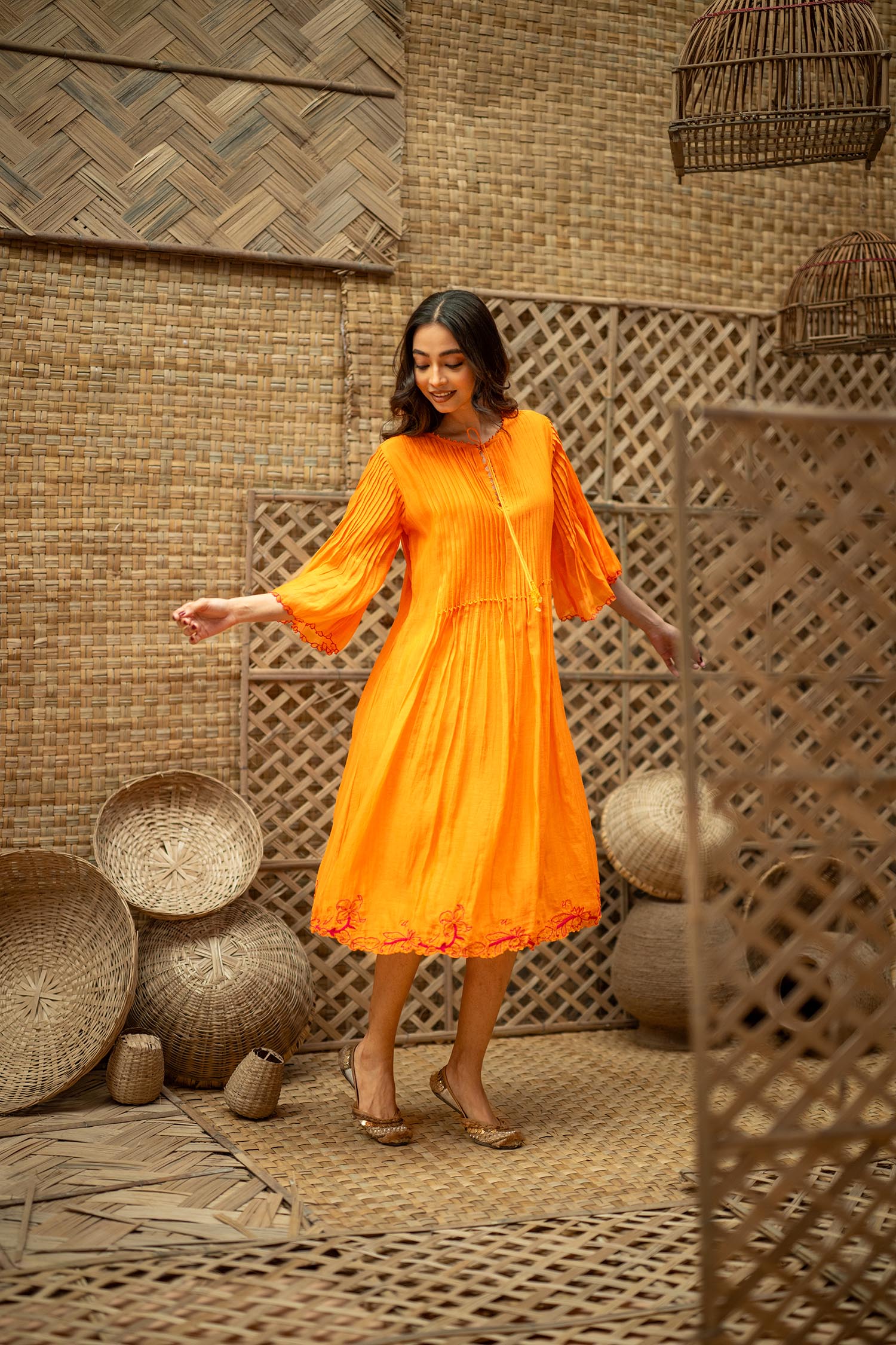 Product Description: Silk chanderi contrast Applique and cutwork flounce dress With beaded floral details. The dress consists of clean pleated yoke and sleeve with cutwork edges.