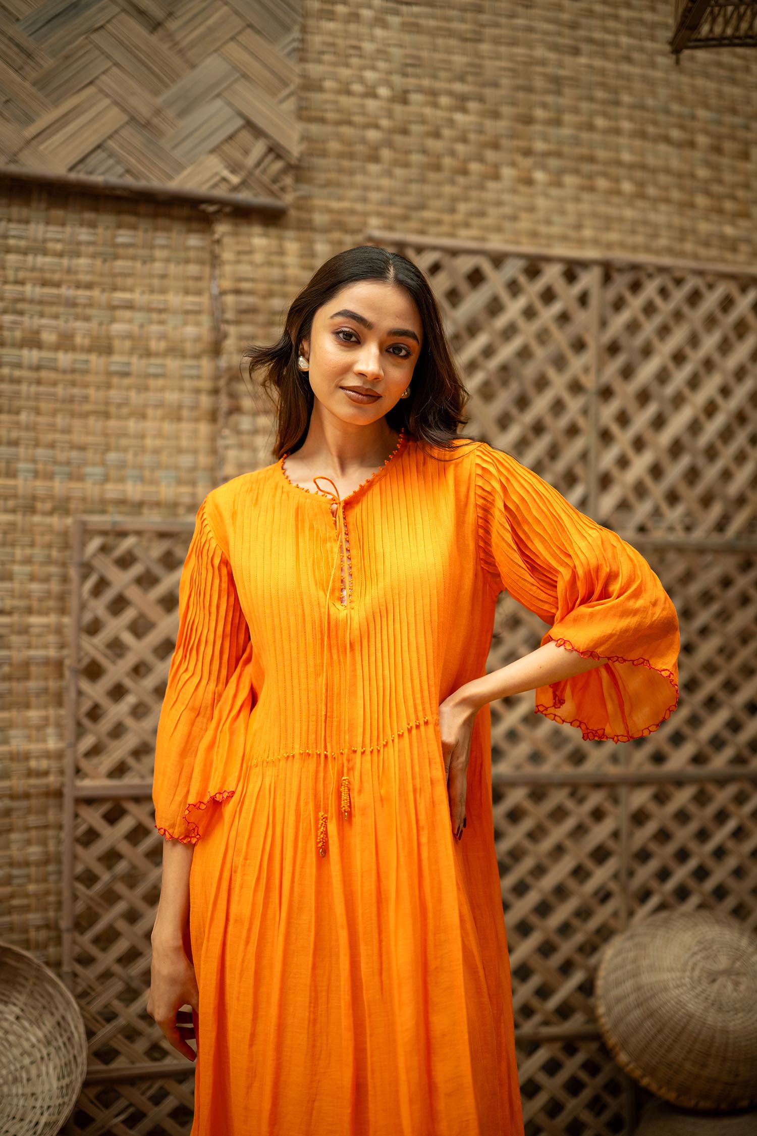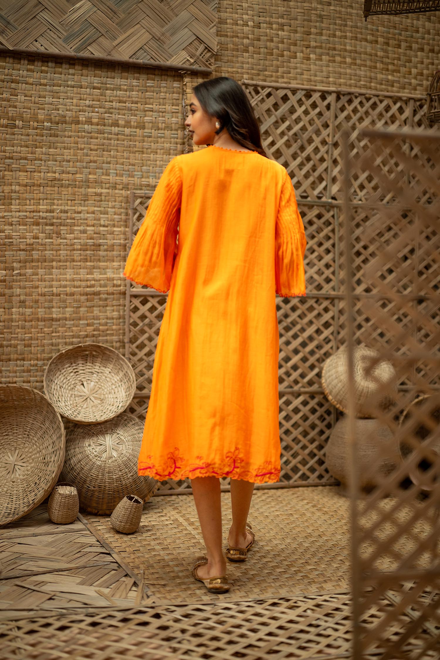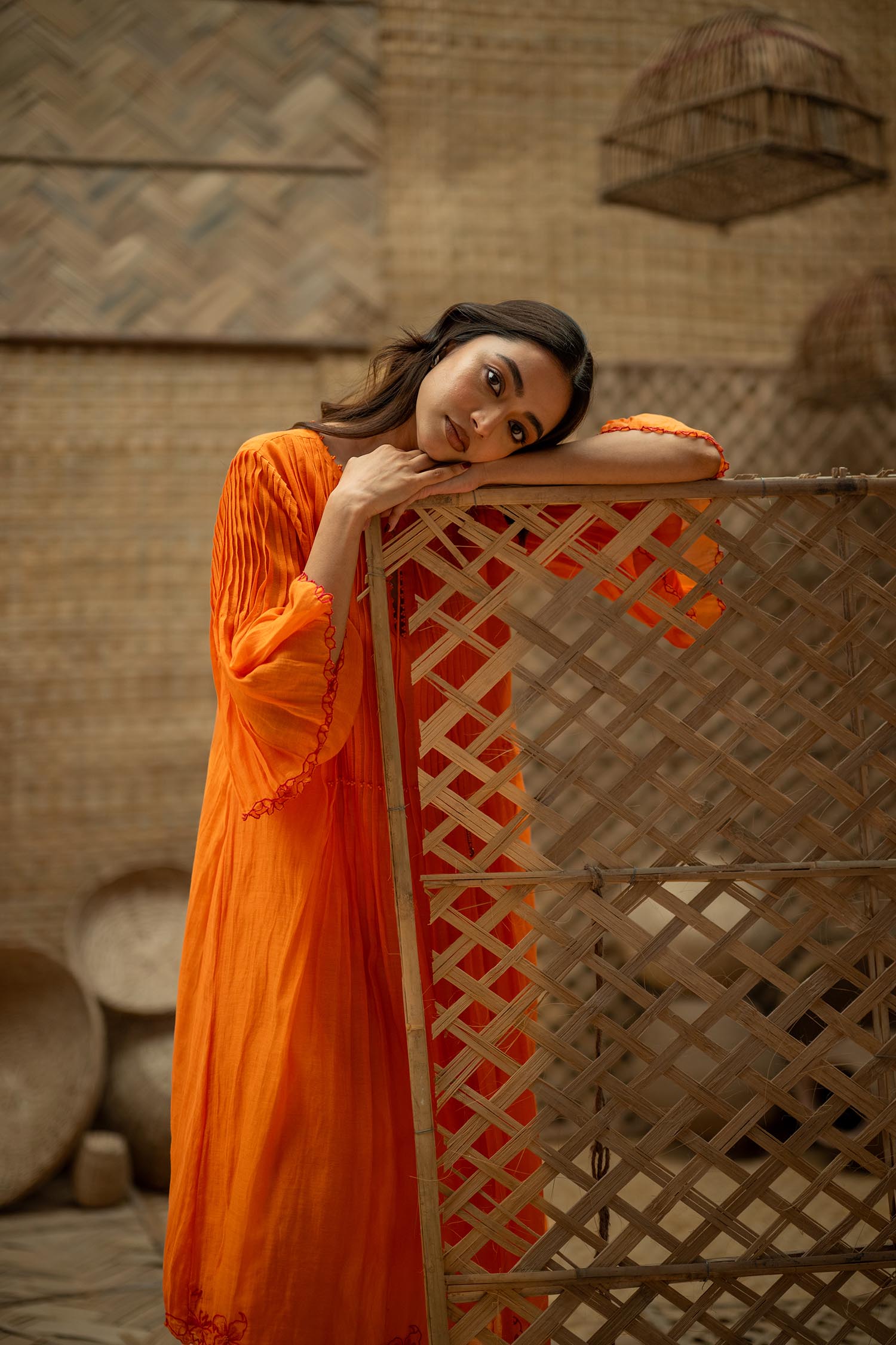 Product Description: Silk chanderi contrast Applique and cutwork flounce dress With beaded floral details. The dress consists of clean pleated yoke and sleeve with cutwork edges.