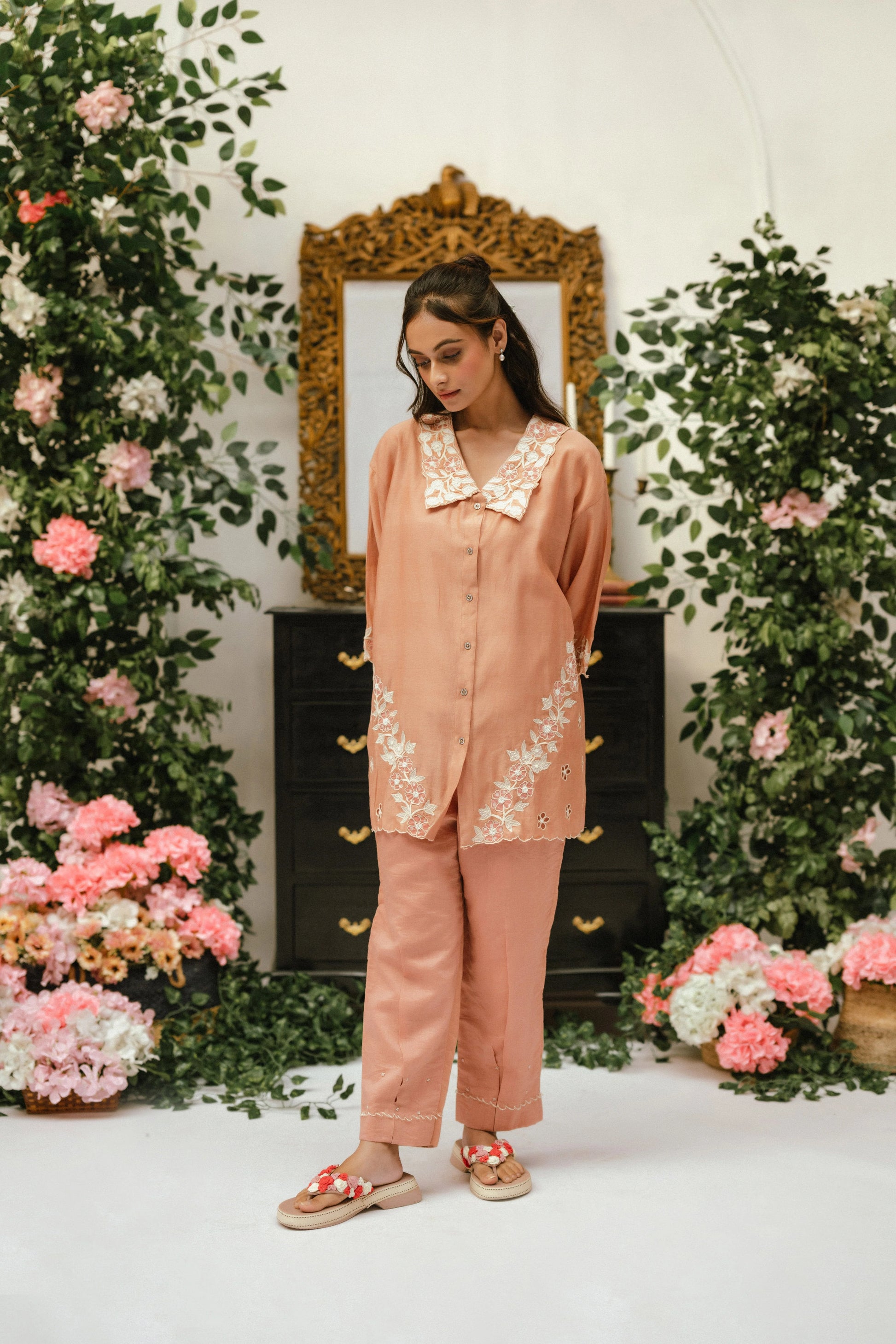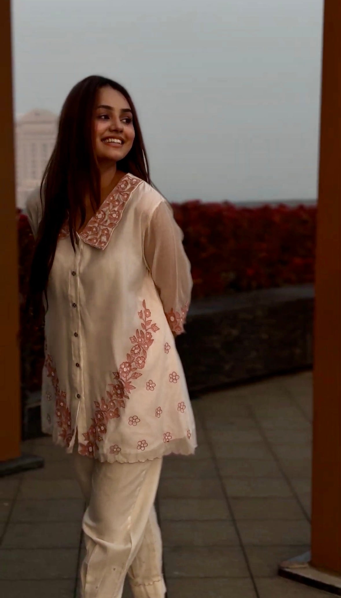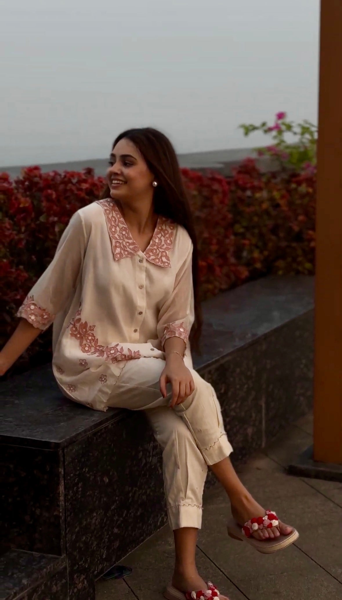 Product Description: Venus is a delicate piece from our collection The Romantics,it comes in a set of two; trousers and top. The top features a vintage trimmed collar with beads and appliuque hand work. The set in made on cotton silk