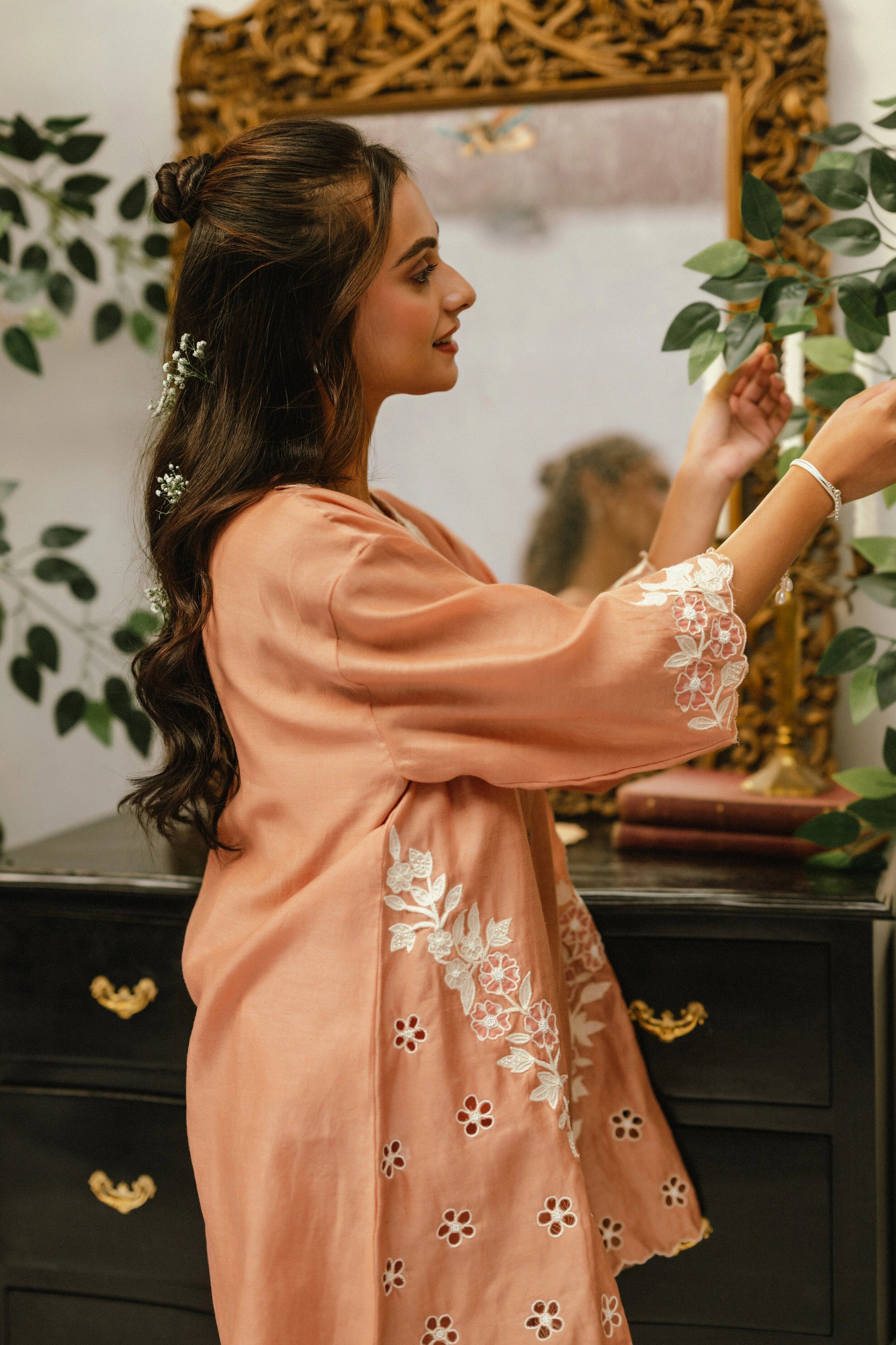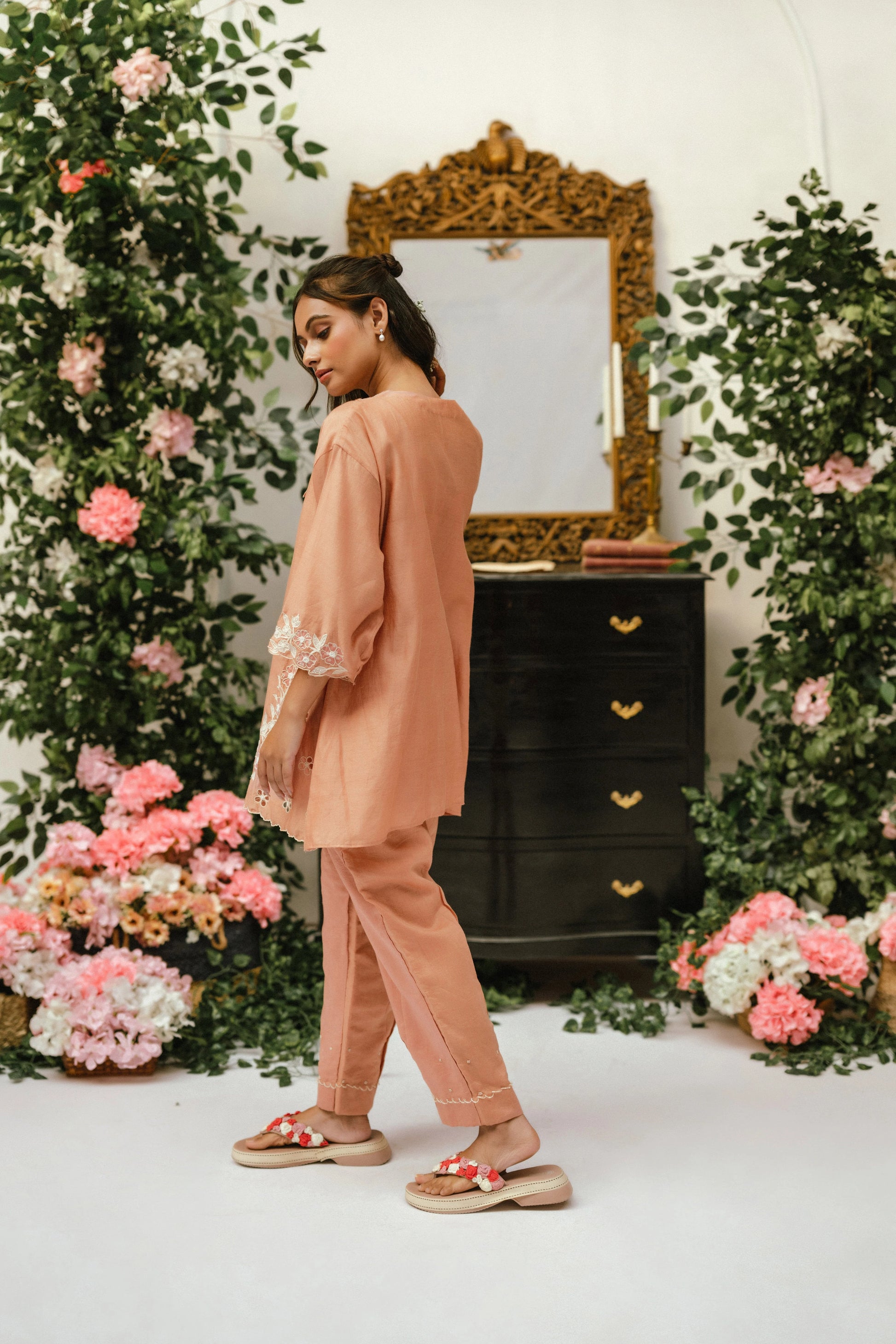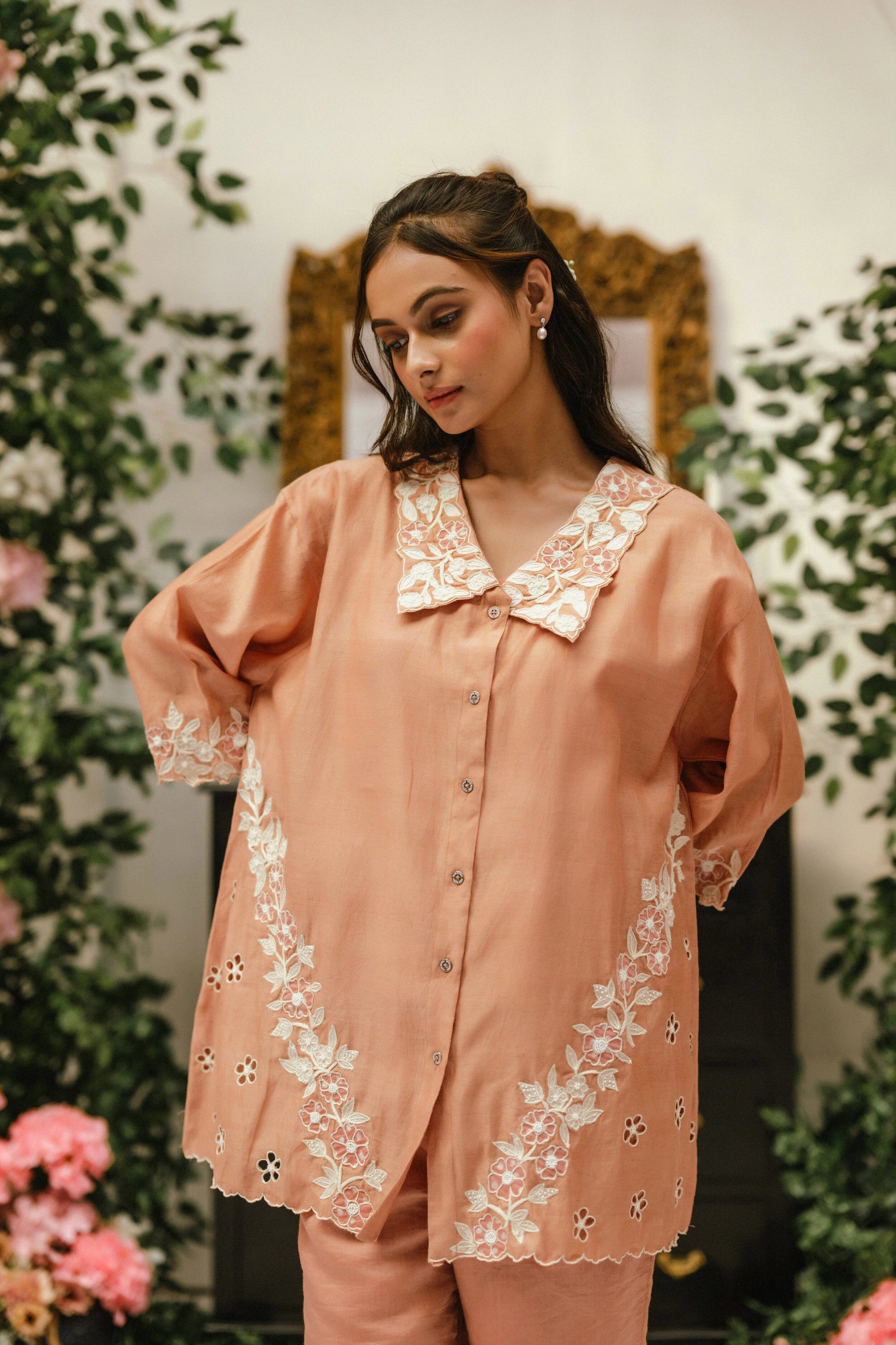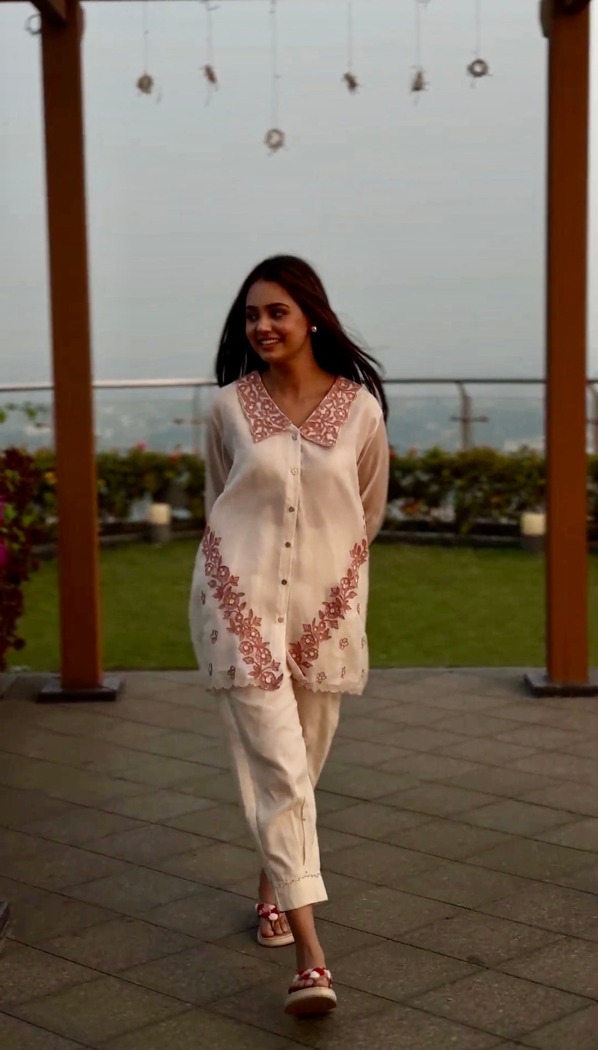 Product Description: Venus is a delicate piece from our collection The Romantics,it comes in a set of two; trousers and top. The top features a vintage trimmed collar with beads and appliuque hand work. The set in made on cotton silk