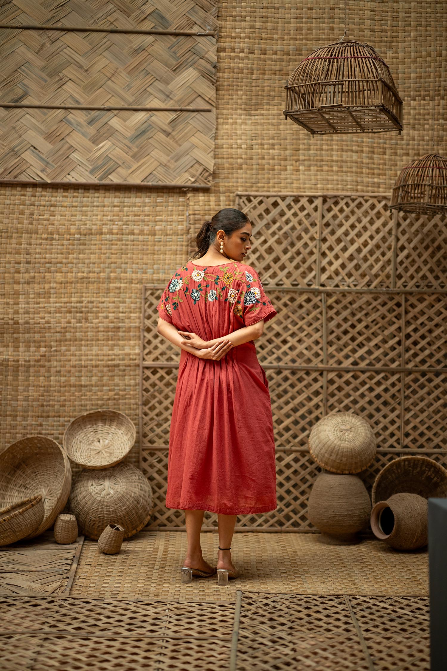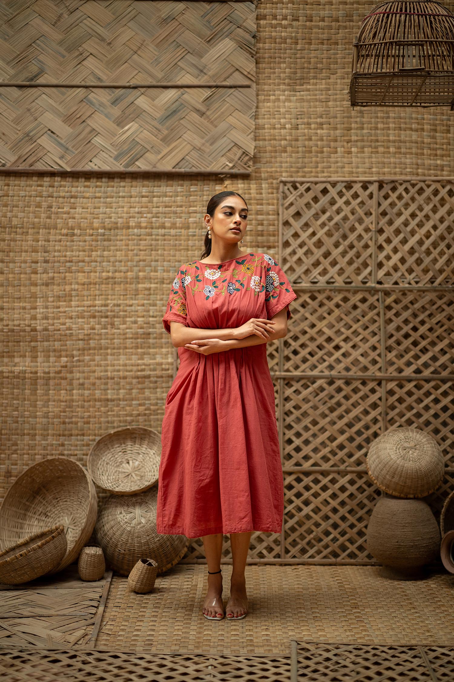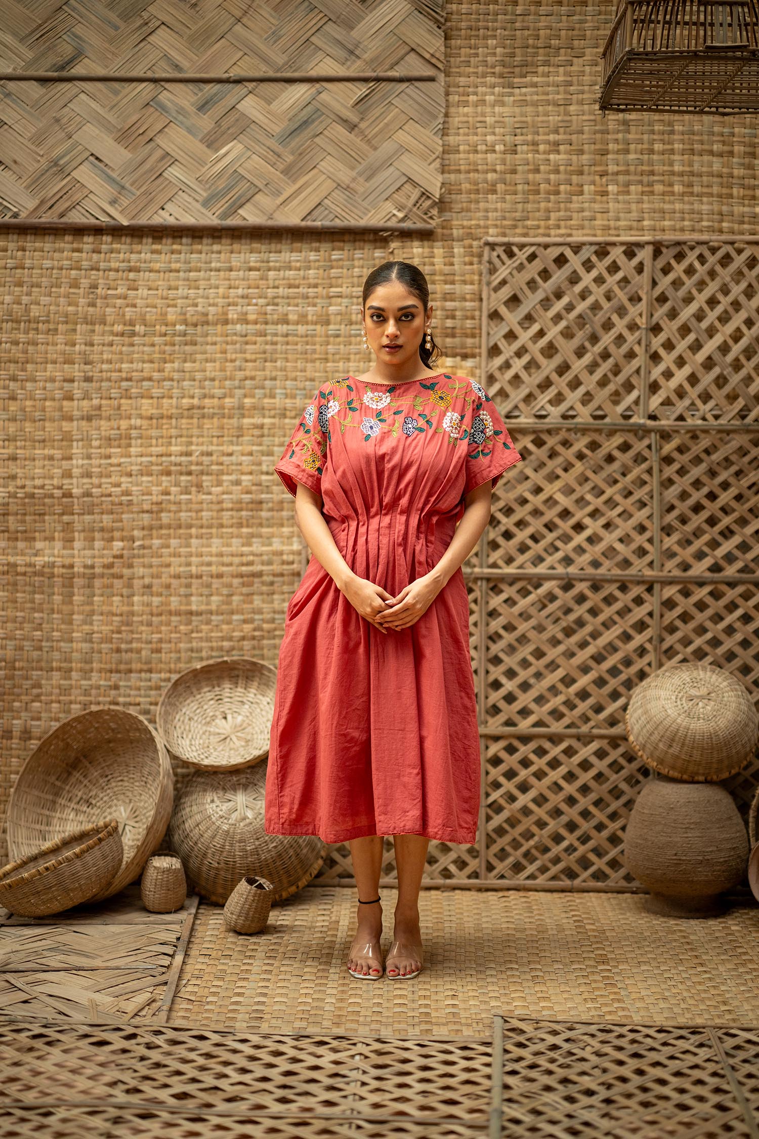 Product Description: Floral Applique and sequin hand embroidered dress. The dress has pockets for comfort and pleated waist details. It comes with a separate inner.